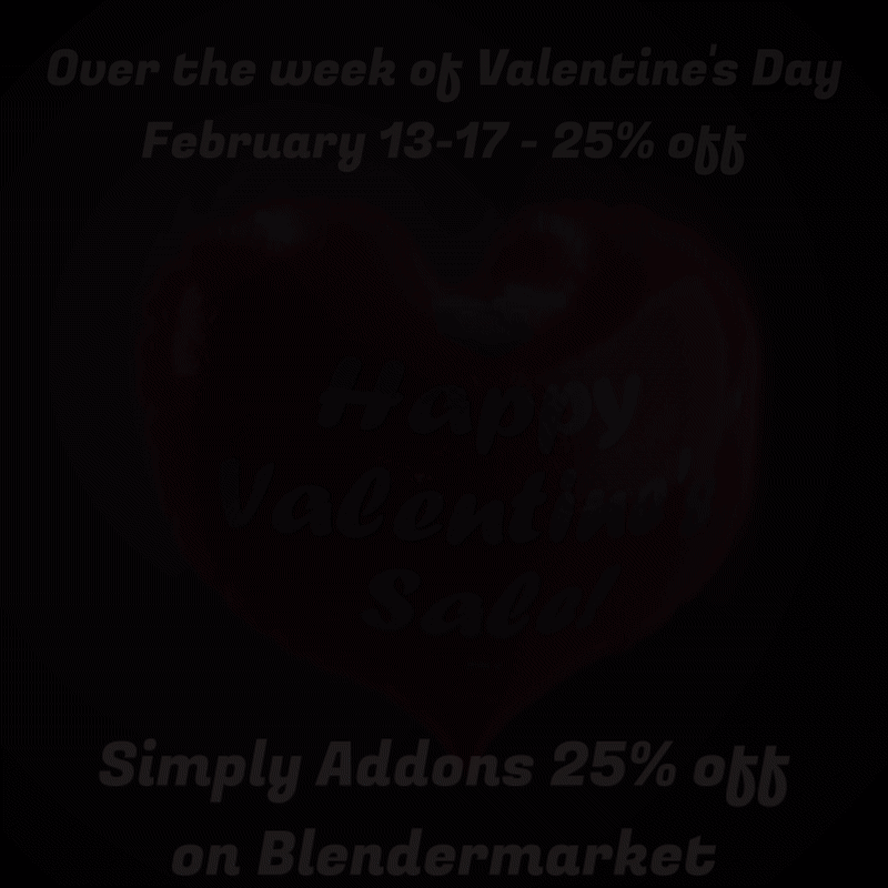 Blendermarket Valentines day sale Start: Monday, February 13th at 12:01am CSTEnd: Friday, February 17th at 11:59pm CSTSimply Addons 25% off – click here